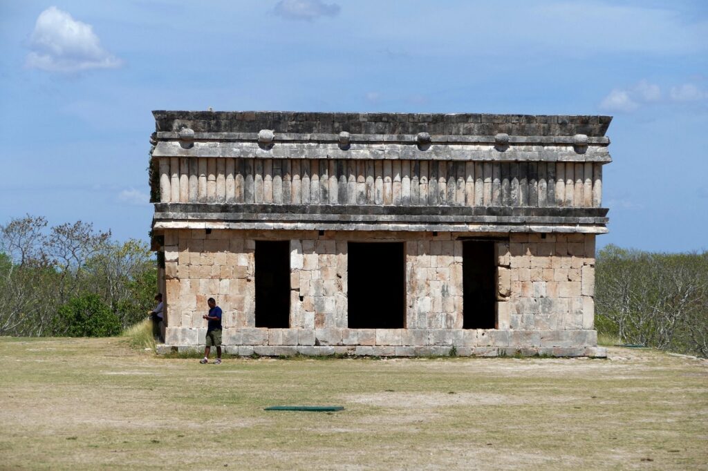 4つの細長い建物が中庭を囲む宮殿跡。壁面には雨の神「チャック」の仮面や幾何学模様、双頭の蛇などの精巧なモザイク装飾が施されています。