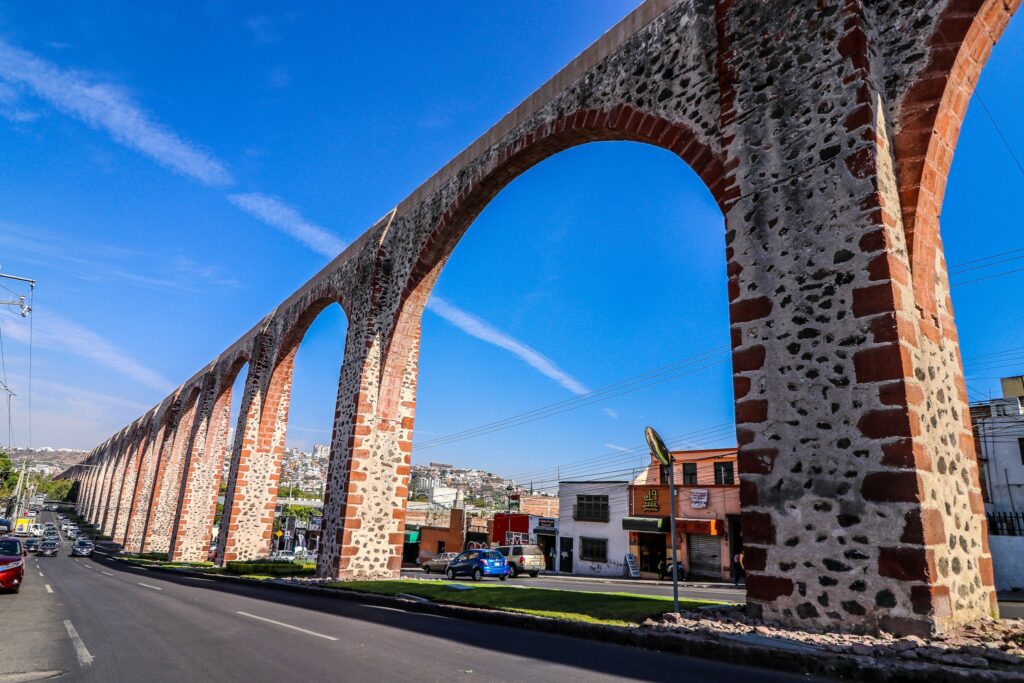 ケレタロの旧市街で、特別な存在感を放つ全長1280m高さ23mの巨大な水道橋。74のアーチが連なる街のシンボルで、近くで見るとその大きさに圧倒されます。