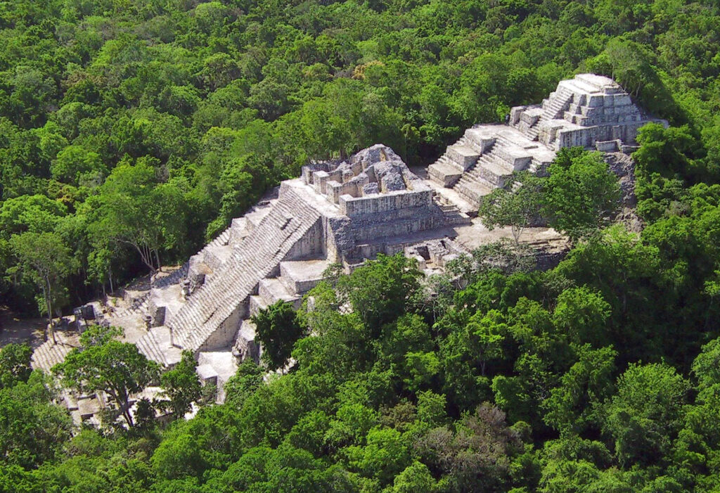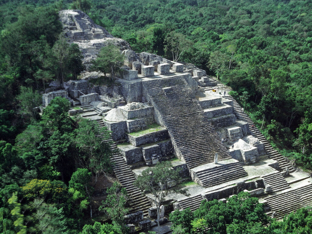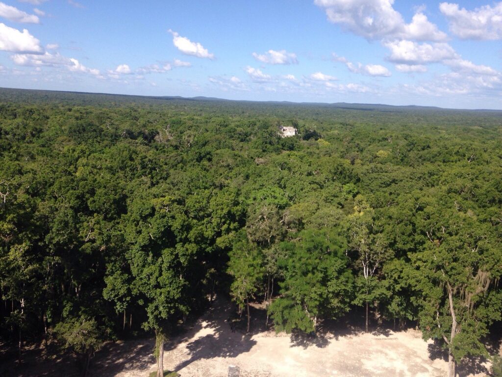 遺跡内にはマヤ地域最大級のピラミッド(建造物2)があり、高さは約45メートルに達します。頂上からは地平線まで続く広大なジャングルを一望できます。