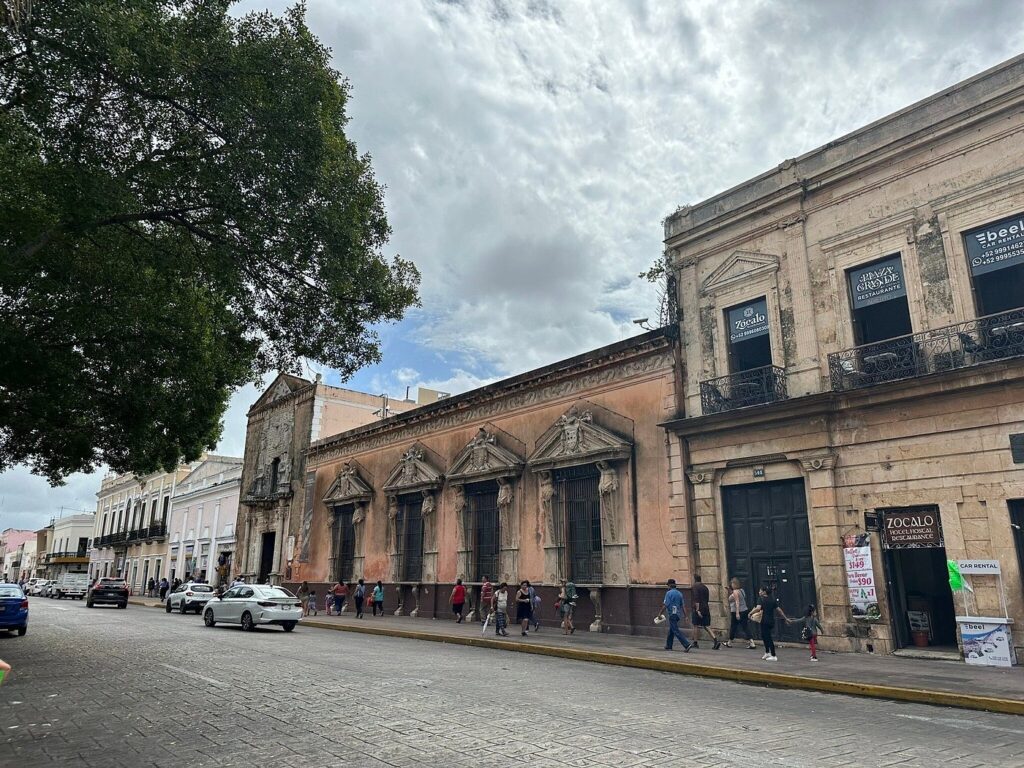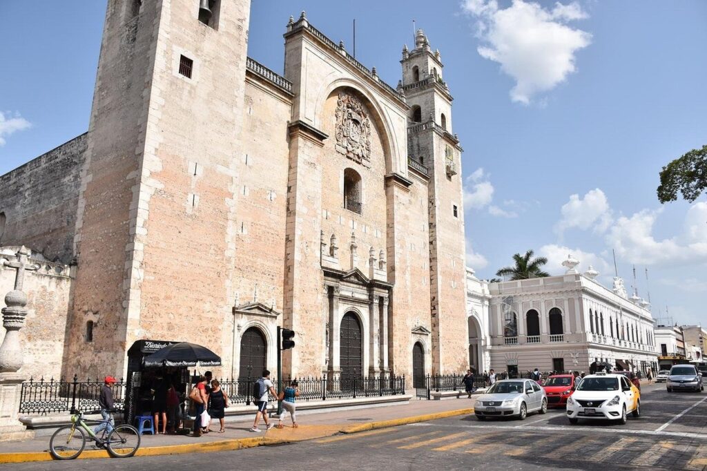 16世紀のスペイン植民地時代にマヤの都市の石材を利用して建設された「白い街」と称されるコロニアル建築の宝庫です。中心のソカロ(中央広場)周辺には、最古の建物モンテホの家や、カテドラル、パステルカラーの街並みが残っており、歴史的な趣を楽しめます。